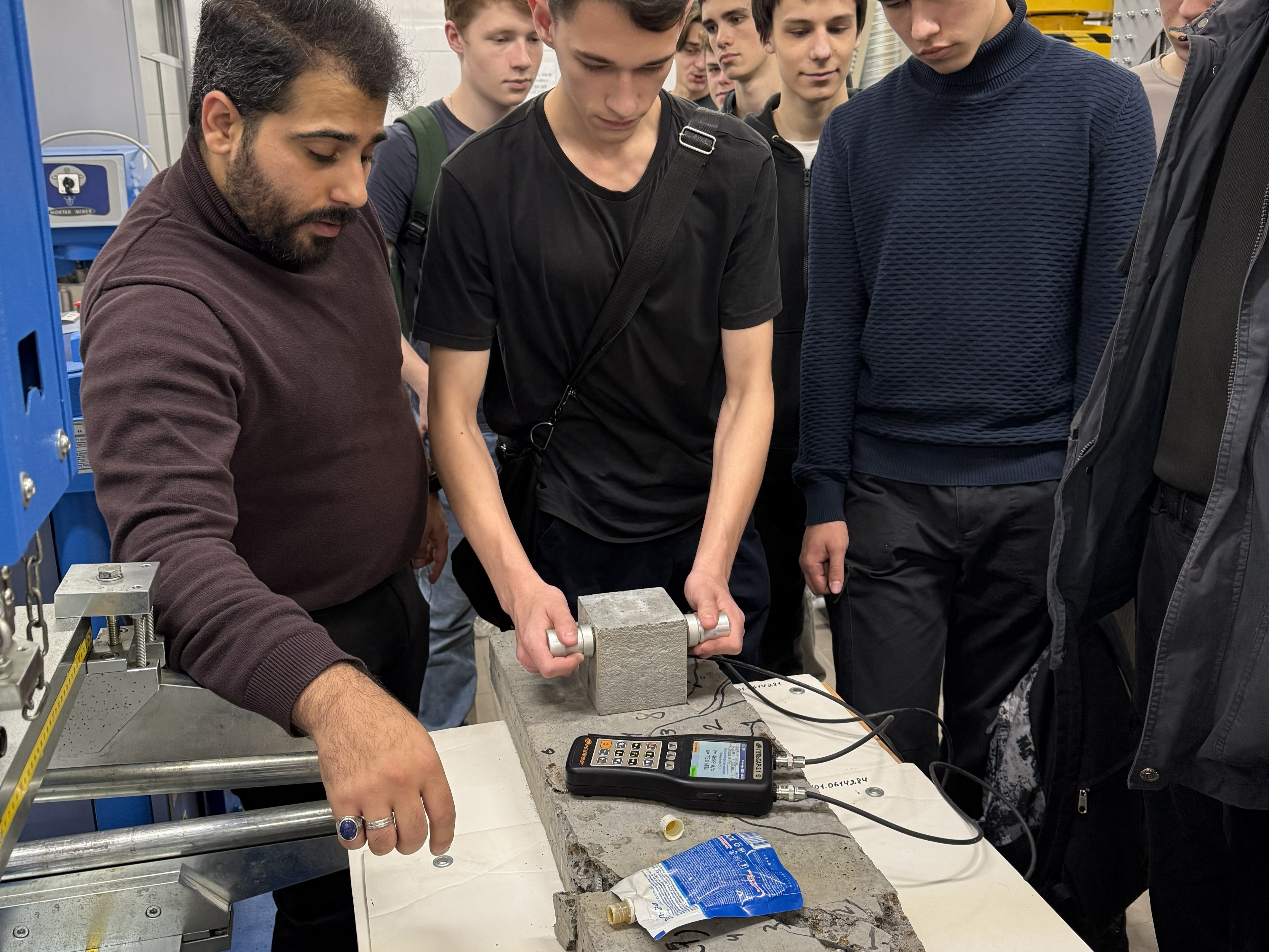 В процессе мастер-класса «Инновационные строительные материалы и конструкции» школьники познакомились с тонкостями профессии инженера-строителя, узнали о последних разработках в области строительных материалов – высокопрочных бетонов, фибробетонов, каутонов, композитов, нанокомпозитов, научились самостоятельно пользоваться ультразвуковыми приборами неразрушающего контроля для определения физико-механических характеристик бетонов, диаметров арматуры в железобетонных конструкциях, толщины защитного слоя арматуры, шага арматуры, познакомились с технологией 3D-печати для вертикальных конструкций зданий, приняли участие в экспериментальных исследованиях бетонных образцов на сжатие.